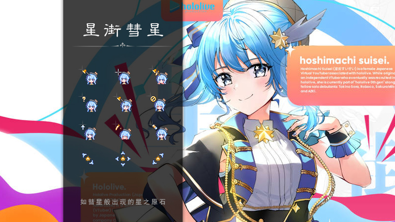 如彗星般出现星之原石。我是虚拟偶像星街彗星。以至今为止积累的全部、以从现在开始积累的全部,向大家传达最好的音乐与舞台。无法忘却的瞬间、请与我共有吧,麻烦请你多多指教。